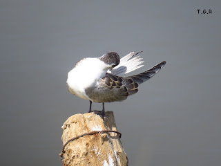 El Fumarel Cariblanco (Chlidonias hybridus), es una ave emparentada con gaviotas y charranes, éstos ultimos también llamados, como golondrinas de mar. El mayor de nuestros fumareles, tiene en plumaje adulto un bello capirote oscuro y las mejillas de color blanco, contrastando con el resto del cuerpo gris ceniza oscuro y dorso y alas, gris plateado. Proporcionalmente, es el fumarel con las patas más largas y el pico más robusto. La cola es corta y algo ahorquillada de tonos gris claro. Patas y pico de color rojo sangre. Se alimentan en vuelo, sobre la superficie del agua en busca de pececillos, insectos y renacuajos.Cría en Europa, nidificando en varias zonas de la geografía peninsular. Las mejores poblaciones más cercanas, se sitúan en el Embalse de El Hondo de Elche, en Alicante. En Murcia nidifica en pocos puntos, siendo las lagunas de Campotéjar, en Molina de Segura, uno de los pocos sitios donde se reproduce. Generalmente es un ave estival que nos visita con el buen tiempo, aunque suelen quedarse algunos individuos durante el invierno.